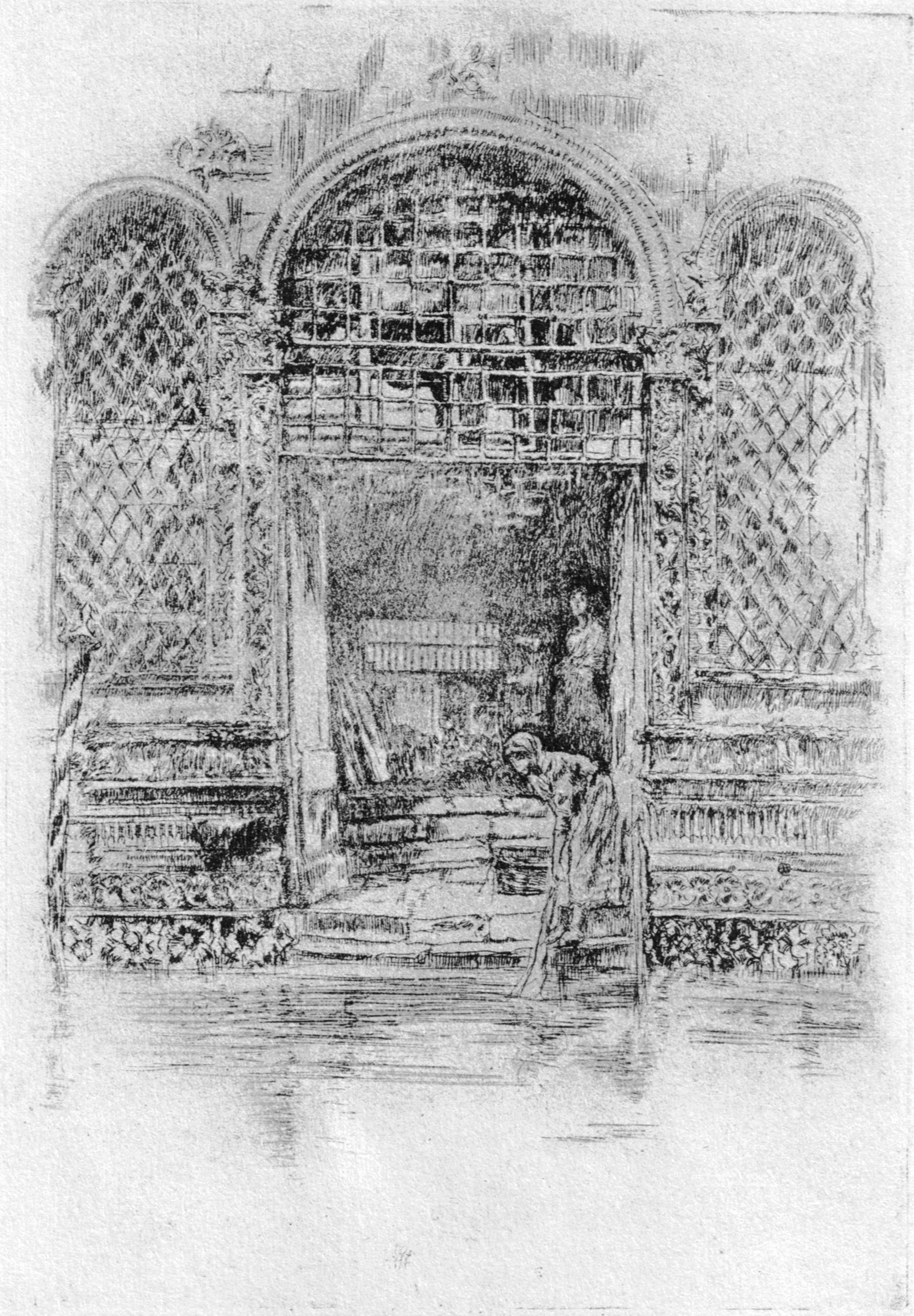 „Brama” to prawdopodobnie jeden z widoków, które Whistler szkicował siedząc w gondoli. Praca była częścią serii powstałej na zlecenie londyńskiego Fine Art Society. Whistler dotarł do Wenecji we wrześniu 1879 roku i spędził tam kolejnych czternaście miesięcy. Efektem jego pracy w tamtym okresie było dwanaście doskonałych grafik, w tym nabyta przez Sachsa „Brama”. Akwaforta ukazuje bogato zdobiony portal Palazzo Gussoni mieszczący się przy Rio della Fava, niedaleko mostu Rialto. Za czasów Whistlera znajdował się tam warsztat tkacki, w którego zacienionym wnętrzu widoczna jest postać kobieca. Od ciemnego prostokątnego wejścia odcina się fasada budynku – rozświetlona wibrującymi promieniami słońca, które osiadają na rzeźbionych fryzach, metalowych kratach i odbijają się w falach kanału. Maestria grafiki jest widoczna w kontraście między ornamentalną, górną częścią kompozycji a rozmytą partią kanału na dole obrazu.